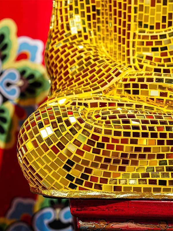 This handmade mirror mosaic Buddha Sculpture is designed and produced by our factory for high-end commercial and spiritual spaces. Each sculpture is fully handcrafted using premium glass mirror mosaic tiles, carefully applied to a reinforced internal structure to ensure long-term stability and visual impact.