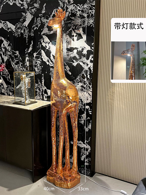 This custom mirrored mosaic Giraffe Sculpture is manufactured with a reinforced Fiberglass (FRP) Structure and finished with hand-inlaid mirrored glass mosaic tiles. With its towering proportions and elegant form, this giraffe sculpture creates a strong visual focal point in commercial interior spaces and art installations.