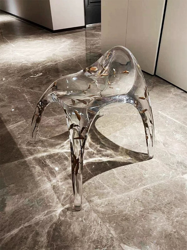 This custom Transparent Resin Sculptural Chair is a high-end piece that combines contemporary artistic expression with functional furniture. The chair features an organic, flowing sculptural form, crafted as a single piece from high-quality transparent resin, with natural botanical elements embedded inside, creating a visual sense of growth and nature.
